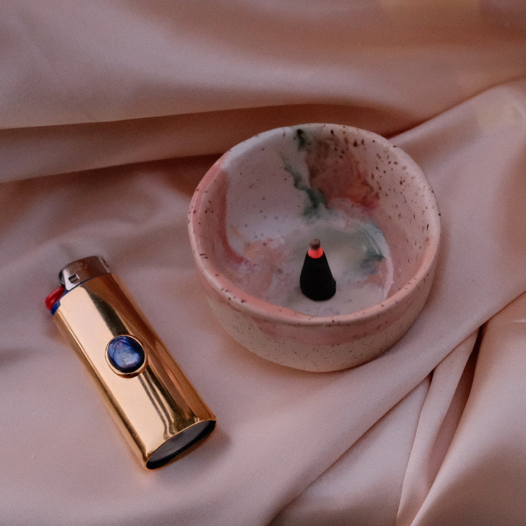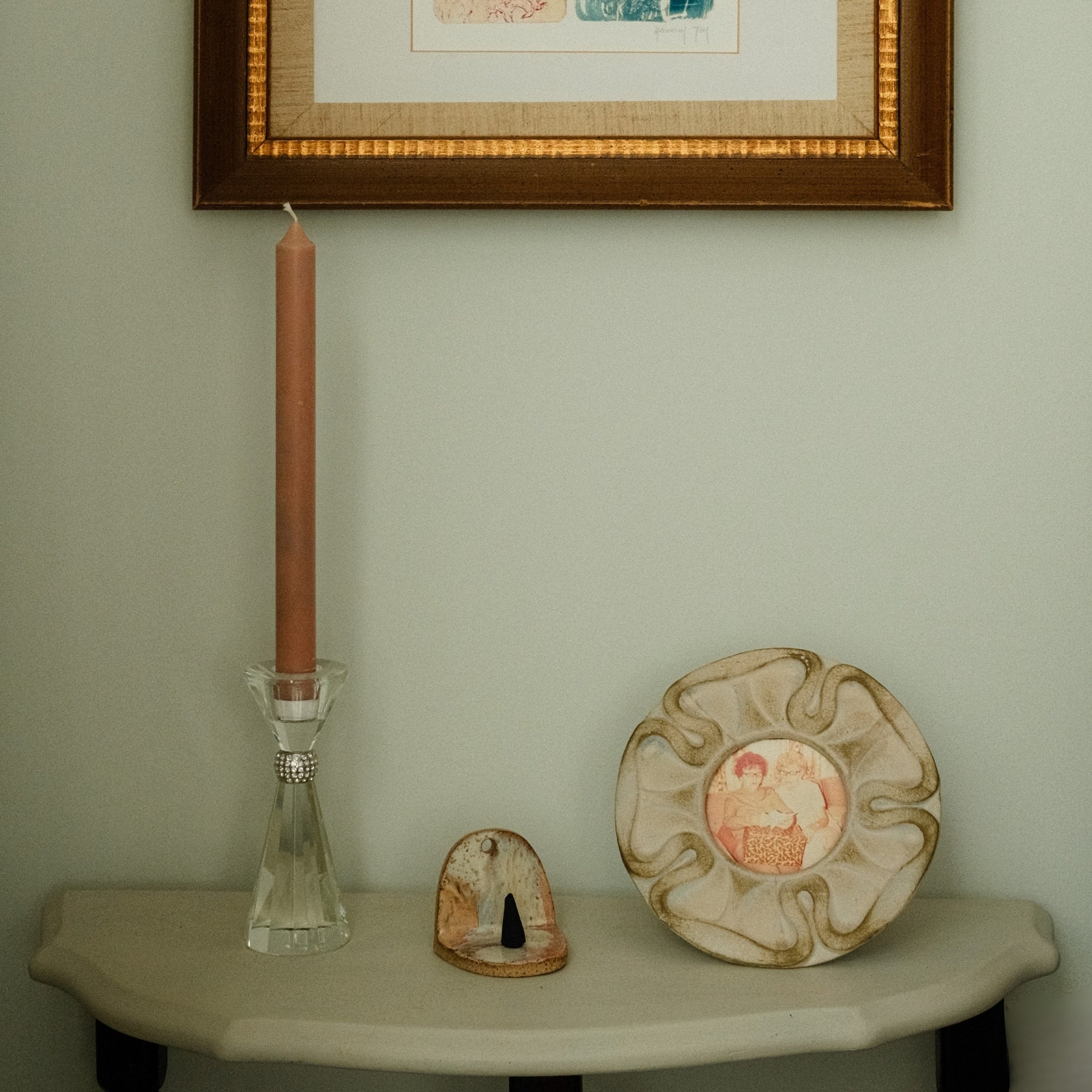 We have partnered multiple times with our friend and ceramic artist Emily Reinhardt. Our most recent collaboration came about while visiting in her studio space and seeing a prototype that we envisioned being used for incense. From there she created our "incense altar" that can be hung on the wall or set on a table.